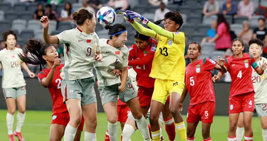 শক্তির বিচারে অনেক এগিয়ে থাকা চীনের বিপক্ষে শুরুটা দুর্দান্ত করেছিল বাংলাদেশ নারী ফুটবল দল। ৪৪ মিনিট পর্যন্ত বর্তমান চ্যাম্পিয়নদের আটকে রেখেছিল পিটার বাটলারের শিষ্যরা। তবে শেষ দিকে এসে তা ধরে রাখতে পারেনি লাল-সবুজের প্রতিনিধিরা। জোড়া গোল হজম করে প্রথমার্ধ শেষ করেছে বাংলাদেশ।