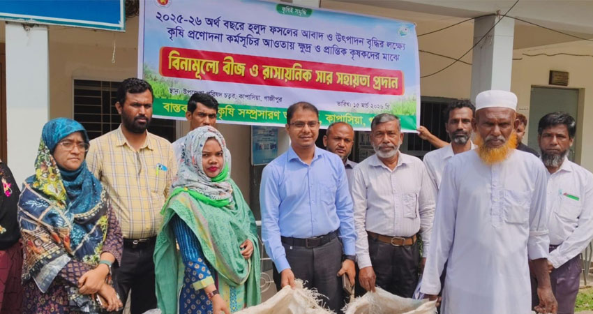 গাজীপুরের কাপাসিয়ায় ২০২৫-২৬ অর্থবছরে হলুদ ফসলের আবাদ ও উৎপাদন বৃদ্ধির লক্ষ্যে কৃষি প্রণোদনা কর্মসূচির আওতায় ক্ষুদ্র ও প্রান্তিক কৃষকদের মাঝে বিনামূল্যে বীজ ও রাসায়নিক সার বিতরণ করা হয়েছে।