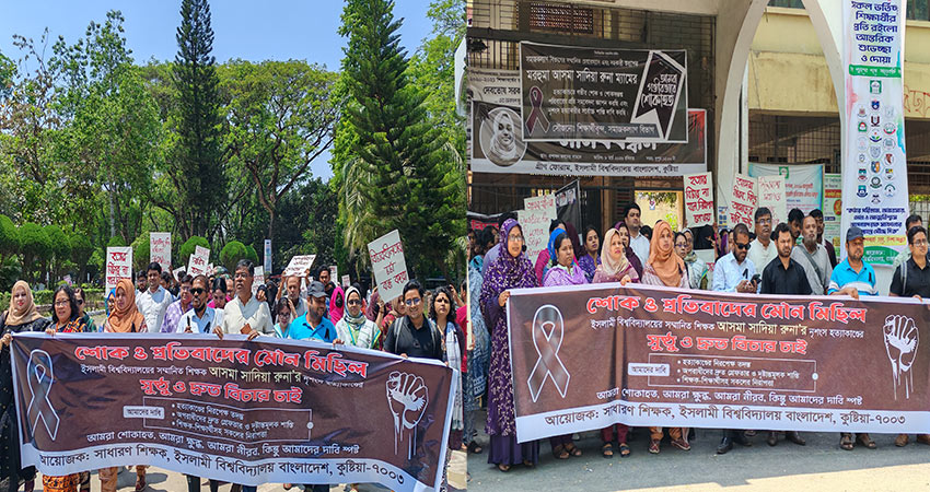 ইসলামী বিশ্ববিদ্যালয়ের (ইবি) সমাজকল্যাণ বিভাগের সভাপতি সহকারী অধ্যাপক আসমা সাদিয়া রুনা হত্যাকাণ্ডের বিচার ও জড়িত সকল আসামিকে দ্রুত গ্রেফতারের দাবিতে শোক ও প্রতিবাদী মৌন মিছিল অনুষ্ঠিত হয়েছে।