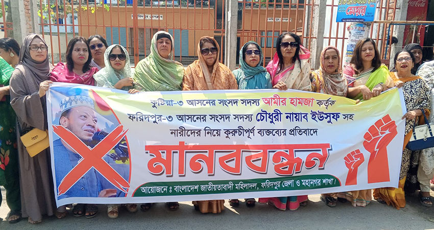 কুষ্টিয়া-৩ আসনের সংসদ সদস্য মুফতি আমির হামজা কর্তৃক ফরিদপুর সদর -৩ আসনের সংসদ সদস্য চৌধুরী নায়াব ইউসুফসহ কয়েকজন নারী সংসদের নাম জড়িয়ে কুরুচিপূর্ণ বক্তব্য দেওয়ার প্রতিবাদে ফরিদপুরে মানববন্ধন কর্মসূচি পালন করেছে ফরিদপুর জেলা ও মহানগর মহিলাদল।