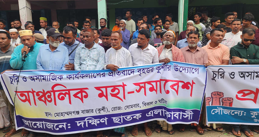 বক্তব্য রাখেন ও উপস্থিত ছিলেন, মোর্শেদ আহমদ চৌধুরী (সাবেক চেয়ারম্যান, সিংচাপুর ইউনিয়ন পরিষদ) শায়েক আহমেদ (বর্তমান মেম্বার, ৩নং ওয়ার্ড ও মুখপাত্র- চোর নির্মূল কমিটি) আব্দুল কদ্দুস (লন্ডন প্রবাসী) মজনু মিয়া,আব্দুল কাহার আলী হোসেন (সভাপতি, কুর্শী মোহাম্মদগঞ্জ বাজার) আব্দুল হক (সাবেক মেম্বার) হাফিজুর রহমান (বরাটুকা) মুসলিম উদ্দিন (বরাটুকা) নুরুল হক (সভাপতি, কুর্শী ইসলামপুর দাখিল মাদ্রাসা) আব্দুস সোবহান বাদাই সাকিল আহমদ, শামীম আহমদ, সায়হাম উদ্দিন সাহেল মিয়া, কামাল আহমেদ (লন্ডন প্রবাসী) হায়দার আলী (সাবেক মেম্বার) আবুল লেইছ, কনা মিয়া তালুকদার, সাহেব আলী, আয়ূব আলী নুর ইসলাম, নজির আলী, সুলতান আহমদ, সুনা মিয়া টেইলার সমাবেশ শেষে একটি মানববন্ধন অনুষ্ঠিত হয়, যেখানে অংশগ্রহণকারীরা “চোরমুক্ত কুর্শী চাই, নিরাপদ সমাজ চাই” স্লোগান দেন। এলাকাবাসী হুঁশিয়ারি দিয়ে বলেন-দ্রুত ব্যবস্থা না নিলে ভবিষ্যতে আরও কঠোর কর্মসূচি ঘোষণা করা হবে।