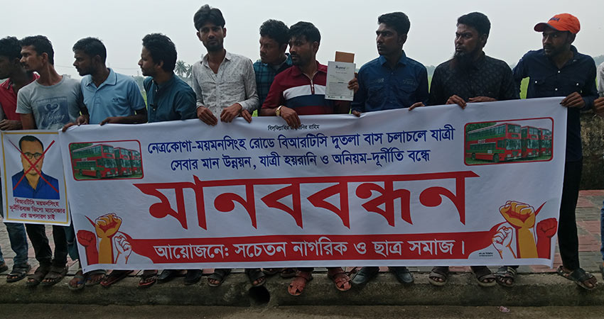 নেত্রকোণা-ময়মনসিংহ সড়কে বিআরটিসির দোতলা বাস চলাচলে যাত্রীসেবার মান উন্নয়ন, যাত্রী হয়রানি বন্ধ এবং অনিয়ম-দুর্নীতির প্রতিবাদে মানববন্ধন কর্মসূচি পালন করা হয়েছে। আজ দুপুর ১২টায় নেত্রকোণা বিআরটিসি বাস স্ট্যান্ডে সচেতন নাগরিক ও ছাত্র সমাজ-এর উদ্যোগে এ মানববন্ধন অনুষ্ঠিত হয়।