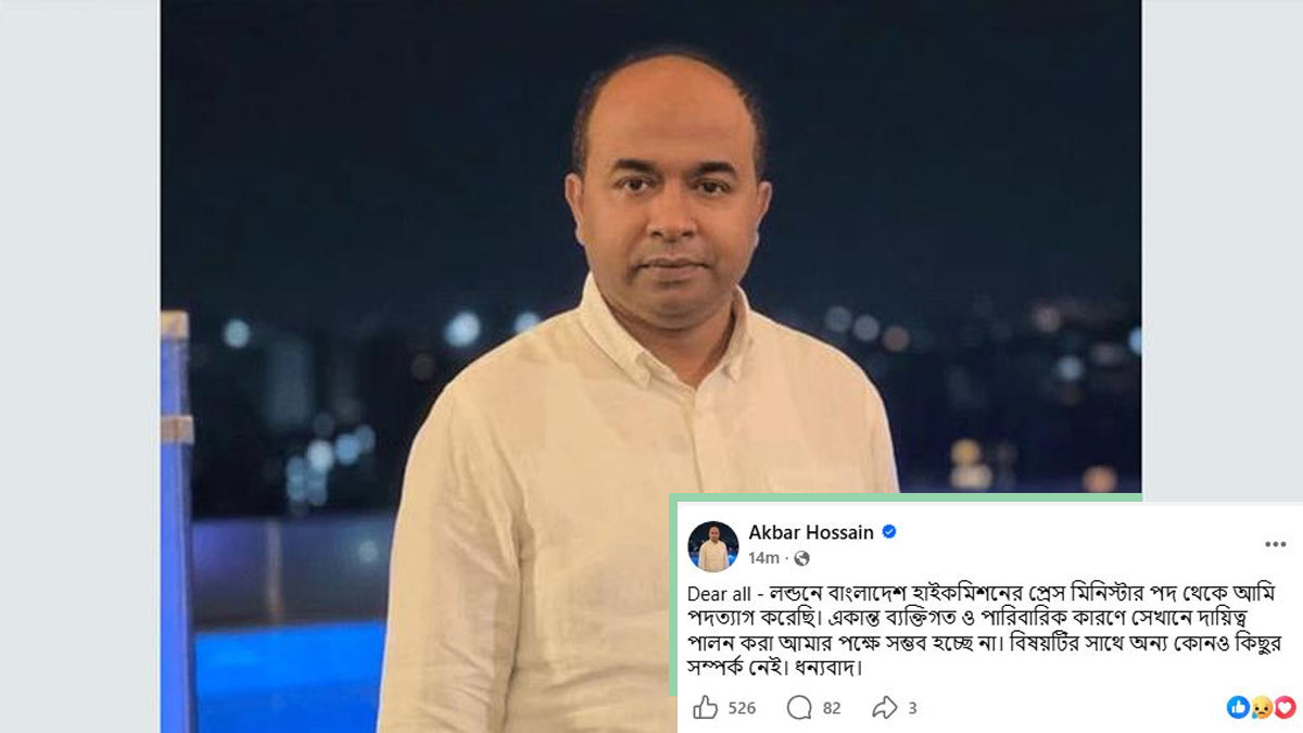 ওই পোস্টে আকবর হোসেন লিখেছেন, “Dear all-লন্ডনে বাংলাদেশ হাইকমিশনের প্রেস মিনিস্টার পদ থেকে আমি পদত্যাগ করেছি। একান্ত ব্যক্তিগত ও পারিবারিক কারণে সেখানে দায়িত্ব পালন করা আমার পক্ষে সম্ভব হচ্ছে না। বিষয়টির সঙ্গে অন্য কোনো কিছুর সম্পর্ক নেই। ধন্যবাদ।”