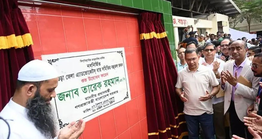 বগুড়ায় সফররত প্রধানমন্ত্রী তারেক রহমান জজ আদালতে ই-বেইল বন্ড সেবার আনুষ্ঠানিক উদ্বোধন করেছেন। সোমবার বেলা ১১টার দিকে বগুড়া সার্কিট হাউস থেকে পায়ে হেঁটে কোর্ট চত্বরে পৌঁছান তিনি। পরে বেলা ১১টা ২০ মিনিটে এ সেবার উদ্বোধন করেন প্রধানমন্ত্রী। একই সময় তিনি বগুড়া জেলা অ্যাডভোকেটস বার সমিতির নবনির্মিত ভবনের নামফলক উন্মোচন করেন।
