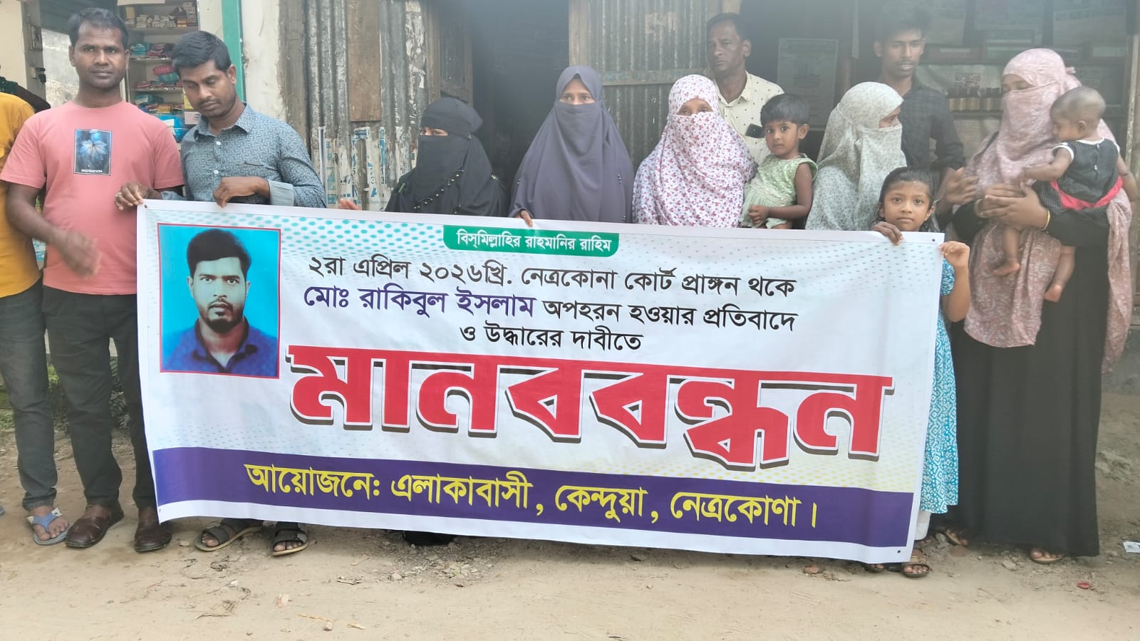 মানববন্ধনে অংশগ্রহণকারীরা রাকিবুল ইসলামের সন্ধান ও নিরাপদে উদ্ধারের দাবি জানান। বক্তারা বলেন, গত ২ এপ্রিল ২০২৬ নেত্রকোণা আদালত প্রাঙ্গণ থেকে রাকিবুল ইসলাম অপহরণের শিকার হন। ঘটনার ২২ দিন পেরিয়ে গেলেও তাঁর কোনো খোঁজ না মেলায় পরিবার ও স্বজনদের মধ্যে উদ্বেগ বাড়ছে।