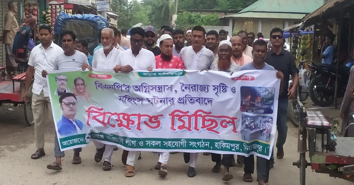 বিএনপির অগ্নিসন্ত্রাস, নৈরাজ্যে সৃষ্টি, সহিংসতা ঘটনার প্রতিবাদে দিনাজপুরের হাকিমপুর হিলিতে আওয়ামীলীগের বিক্ষোভ মিছিল ও প্রতিবাদ সমাবেশ অনুষ্ঠিত হয়েছে।