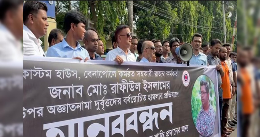 কাস্টমস কর্মকর্তাদের একাত্ম পোষন করে মানব বন্ধন কর্মসুচীতে অংশ নেন বেনাপোল সিএন্ডএফ এজেন্ট মালিক কর্মচারী। আজ বেলা ৩ টায় কাস্টমস হাউজের গেইটে যৌথ মানব বন্ধন কর্মসুচি পালিত হয়।
